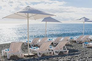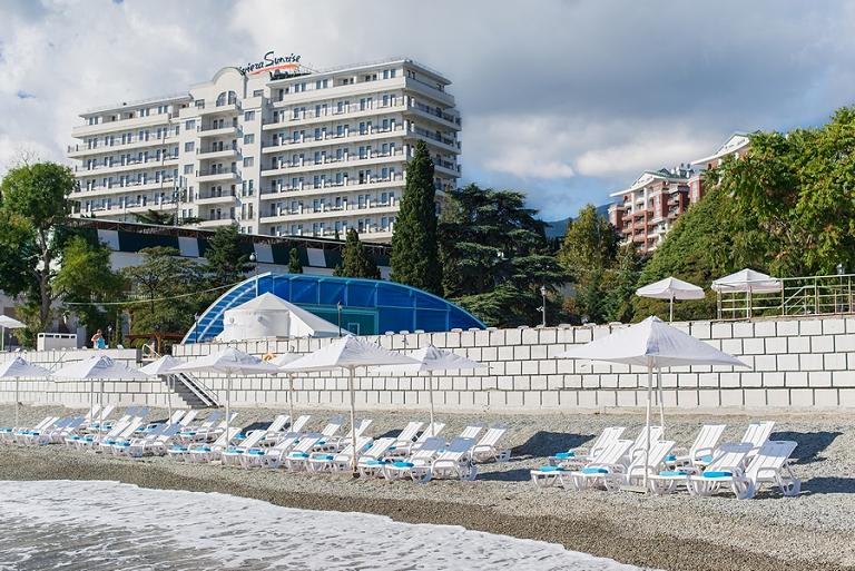 SPA-отель в Крыму имеет в распоряжении собственный мелкогалечный пляж протяженностью 110м. Пляж расположен в 100 м от отеля, оборудован всем необходимым для комфортного и безопасного отдыха: шезлонгами, зонтиками, душевыми, раздевалками, пунктом медицинской помощи. Пляж расположен рядом с открытыми бассейнами, что является ещё одним преимуществом отеля.